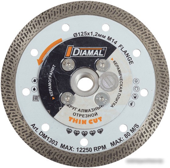 Алмазный отрезной диск Diamal DM1205 предназначен для резки керамогранита и плитки. Он выполнен в сплошной конструкции, что обеспечивает прочность и устойчивость при работе. Диаметр диска составляет 125 мм, а максимальные обороты — 12 250 об/мин, поэтому он хорошо подходит для быстрой и точной резки. Диск работает с сухим резом, что позволяет использовать его без воды. Посадочный диаметр M14 облегчает монтаж на различных инструментах. Этот диск отлично подходит для тех, кто ищет надежное и долговечное оборудование для работы с твердыми материалами. Он обеспечивает чистый и ровный срез благодаря острой режущей кромке.