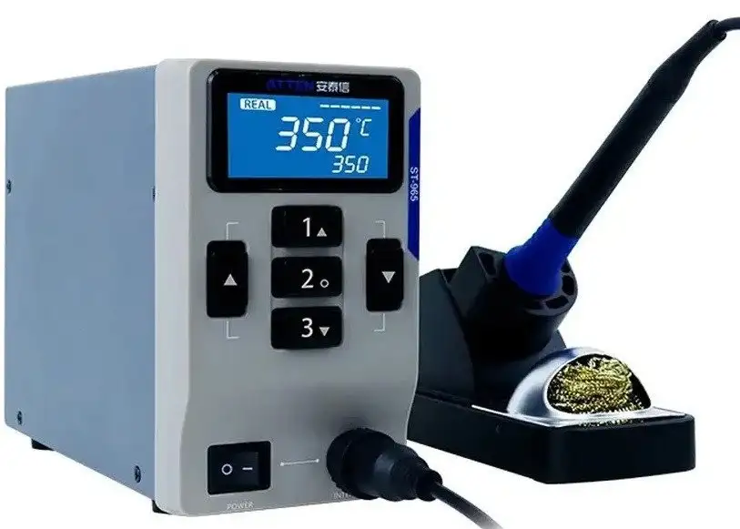 Паяльная станция Atten ST-965 подойдет для точной работы с электроникой. Она имеет регулировку температуры от 200 до 450 °С, что удобно для разных задач. Мощность устройства составляет 65 Вт, что обеспечивает быстрое нагревание. Стальная конструкция весом 1,97 кг делает ее стабильной и надежной в использовании. В комплект входит паяльная станция, подставка для паяльника и инструкция по эксплуатации. Устройство легко управлять благодаря цифровой регулировке температуры. Эти функции помогут вам выполнить пайку точно и безопасно.