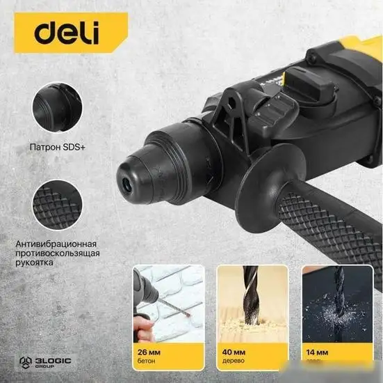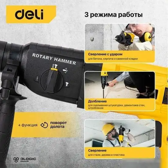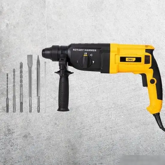 Перфоратор Deli DL-DC26-E1 мощностью 800 Вт подходит для работы с бетоном, металлом и деревом. Он обеспечивает три режима работы: сверление, сверление с ударом и долбление, что делает его универсальным инструментом. Патрон SDS-plus позволяет быстро менять оснастку, а максимальный диаметр сверления в бетоне достигает 26 мм. Перфоратор имеет частоту ударов 5 500 ударов в минуту и энергию удара 3 Дж, что обеспечивает мощное выполнение задач. В комплект входит кейс, три сверла по бетону, пика, долото и съемная рукоятка для удобства работы. Режим ограничения глубины сверления помогает добиться точных результатов. Дополнительная рукоятка улучшает контроль за инструментом, а реверс облегчает работу с застрявшей оснасткой. Длина кабеля 2 м дает свободу движений, а вес устройства — 5280 г. Такой перфоратор легко использовать на стройке или в мастерской.