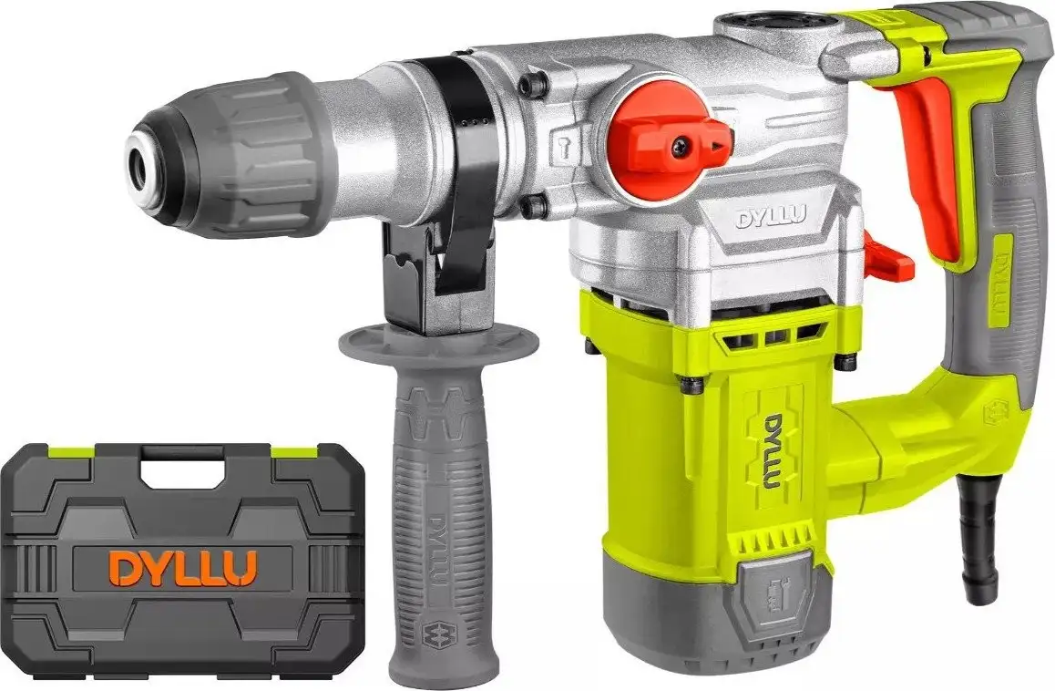 Перфоратор Dyllu DTRH2D26 производства Китая отлично подходит для различных строительных задач. Он работает в трёх режимах: сверление, сверление с ударом и долбление, что делает его универсальным инструментом. Мощность устройства составляет 1050 Вт, а максимальная скорость вращения — 1100 оборотов в минуту, что помогает быстро справляться с задачами. В перфораторе есть патрон SDS-plus, который легко меняется и удерживает разные сверла и насадки. Он способен сверлить бетон до 26 мм, металл — до 13 мм, а дерево — до 40 мм. В комплект входит кейс, три сверла по бетону, а также пика и долото. Вес инструмента — 6150 г, у него есть дополнительная рукоятка для более удобной работы. Этот перфоратор отлично справляется с профессиональными и домашними задачами благодаря своей мощности и комплекту насадок.