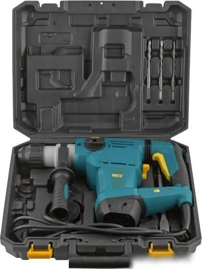 Перфоратор FIT 80117 мощностью 1500 Вт отлично подходит для сверления бетона, металла и дерева. Он работает с патроном SDS-plus и достигает скорости до 950 об/мин и 4300 ударов в минуту, что обеспечивает высокую эффективность. Максимальный диаметр сверления в бетоне — 32 мм, в металле — 30 мм, а в дереве — 40 мм. Устройство включает дополнительную рукоятку для более стабильной работы и предохранительную муфту для безопасности. Он не ограничивается только сверлением — в комплект входит пика (зубило) и долото, расширяя возможности использования. Вес 5200 г, что делает его достаточно удобным для продолжительных работ. В комплекте есть кейс для удобного хранения и транспортировки.