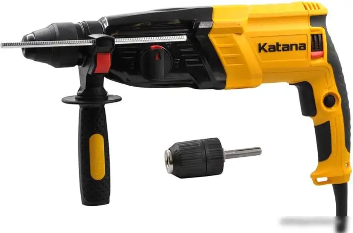 Перфоратор Katana Japan HD8100F предназначен для работы в разных режимах: сверление, сверление с ударом и долбление. Он оснащён мощным двигателем на 1150 Вт, который обеспечивает эффективную работу даже с бетонными и металлическими материалами. Патрон SDS-plus позволяет быстро менять оснастку и сверла, а комплект включает три сверла и два зубила для различных задач. Устройство обладает функцией остановки при заклинивании и предохранительной муфтой для безопасности. Встроенная регулировка глубины сверления и фиксация кнопки делают работу удобной и точной. Реверс помогает извлекать застрявшие сверла, а дополнительная рукоятка улучшает управление. Перфоратор не имеет противовибрационной защиты, но благодаря мощности он справляется с трудными материалами. Он оборудован быстрым зажимным патроном и поставляется в пластиковом кейсе, что облегчает транспортировку и хранение. Благодаря этим характеристикам инструмент подходит как для профессионалов, так и для домашних мастеров.