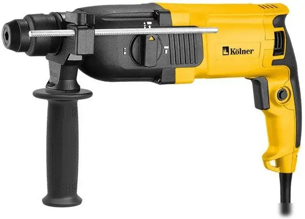 Перфоратор Kolner KBH 3-26K подходит для разных работ, таких как сверление, сверление с ударом и долбление. Он работает от сети с мощностью 800 Вт и оснащен патроном SDS-plus, который помогает быстро менять инструменты. Максимальная скорость вращения достигает 1100 об/мин, а частота ударов — 5400 ударов/мин, что позволяет эффективно работать с материалами разной твердости. Энергия удара составляет 2.5 Дж, что обеспечивает хорошую силу для долбления бетона и других твердых материалов. Максимальный диаметр сверления бетона составляет 26 мм, металла — 13 мм, дерева — 30 мм. В устройстве есть ограничитель глубины и фиксация кнопки включения, это помогает работать удобно и точно. Дополнительная рукоятка добавляет управляемость при работе. В комплект входит кейс, три сверла по бетону и другие необходимые аксессуары, что облегчает транспортировку и хранение. Вес устройства — 2700 г, его удобно держать и использовать продолжительное время.