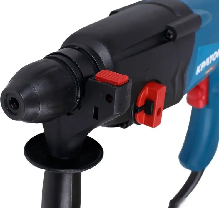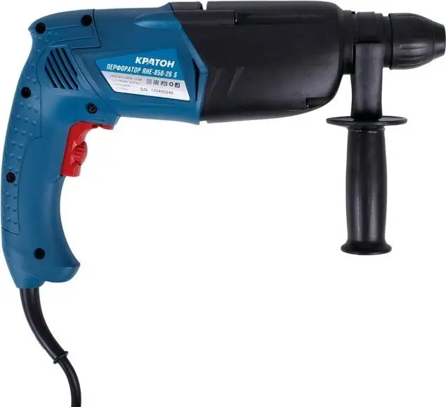 Перфоратор Кратон RHE-850-26S обладает мощностью 850 Вт и тремя режимами работы: сверление, сверление с ударом и долбление. Он оснащён патроном SDS-plus, который быстро меняет насадки, и обеспечивает максимальную глубину сверления до 26 мм в бетоне. Скорость вращения достигает 1100 об/мин, а частота ударов — 5100 ударов в минуту, что помогает эффективно справляться с тяжёлой работой. В устройстве есть ограничитель глубины сверления и кнопка фиксации включения, чтобы упростить работу и снизить утомление. Реверс и дополнительная рукоятка обеспечивают комфортную и безопасную работу. В комплект входит кейс, сверла по бетону, зубило, дополнительная рукоять и пылезащитный колпачок, что делает устройство готовым к использованию сразу после покупки. Вес перфоратора составляет 3400 грамм, что удобно для длительных работ. Особенно стоит отметить надёжный кейс для хранения и переноски инструмента и дополнительных насадок.