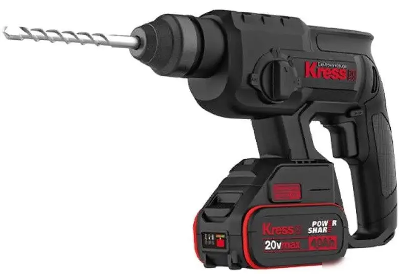Перфоратор Kress KU390.4 хорошо подходит для разных работ: сверления, сверления с ударом и долбления. Он работает на двух аккумуляторах lithium-ion напряжением 20 В и ёмкостью 4 А•ч, что обеспечивает продолжительную работу без перерывов. Устройство использует патрон SDS-plus, позволяя быстро менять насадки. Максимальная скорость вращения достигает 1350 об/мин, а сила удара — 2 Дж, что помогает справляться с бетоном, металлом и деревом. Максимальный диаметр сверления в бетоне — 22 мм, в металле — 13 мм, в дереве — 28 мм. Бесщеточный мотор увеличивает надёжность и срок службы инструмента. Также он оснащён реверсом и индикатором уровня заряда аккумулятора для удобства использования. В комплект входит кейс и две аккумуляторные батареи, что делает работу максимально комфортной и мобильной. Этот перфоратор — хороший выбор для домашних и профессиональных задач.