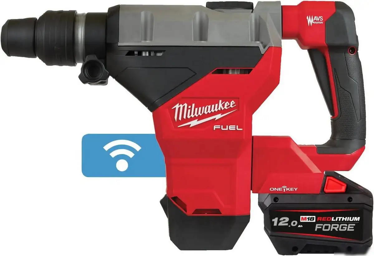 Перфоратор Milwaukee M18FHM-121C — мощное устройство для работы с бетоном и другими материалами. Он умеет сверлить с ударом и долбить, что делает его универсальным инструментом. В нем есть бесщеточный двигатель, который увеличивает эффективность и срок службы. Патрон SDS-max обеспечивает надежную фиксацию сверл и быстрое переключение. Максимальная скорость вращения — 380 об/мин, а энергия удара — 11 Дж, что позволяет быстро справляться с твердыми материалами. У перфоратора есть индикатор уровня заряда и подсветка для удобной работы в темных местах. Также он оснащен противовибрационной системой и остановкой при заклинивании для безопасности и комфорта. В комплект входит кейс, аккумулятор 12 Ач и быстрое зарядное устройство. Устройство управляется через Bluetooth, что помогает отслеживать его состояние. Размеры и вес позволяют легко работать с этим инструментом даже в труднодоступных местах.