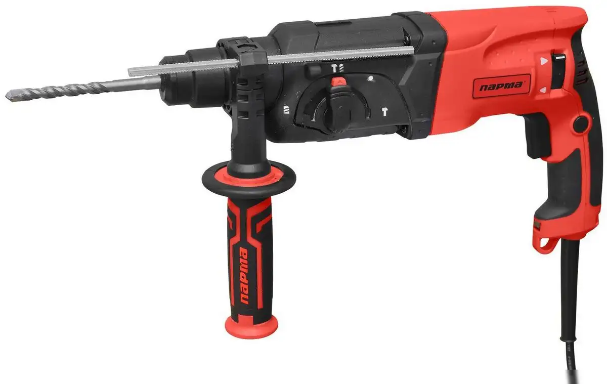 Перфоратор Парма П-01-24/900ЭР сочетает в себе три основные режима работы: сверление, сверление с ударом и долбление. Он работает от сети и обеспечивает мощность 900 Вт, что позволяет легко справляться с бетонными, металлическими и деревянными материалами. Патрон SDS-plus обеспечивает быструю смену оснастки, а максимальная скорость вращения достигает 1100 об/мин. Частота ударов составляет 4500 ударов в минуту, а энергия удара — 2.6 Дж, что помогает эффективно разрушать материалы. Устройство оснащено реверсом и дополнительной рукояткой для удобства при работе. Максимальный диаметр сверления в бетоне составляет 24 мм, а в металле — 13 мм. Длина кабеля — 2.2 метра, а вес — около 3,25 кг, что позволяет работать без особых усилий. В комплект входит кейс и сверла, что удобно для хранения и транспортировки.