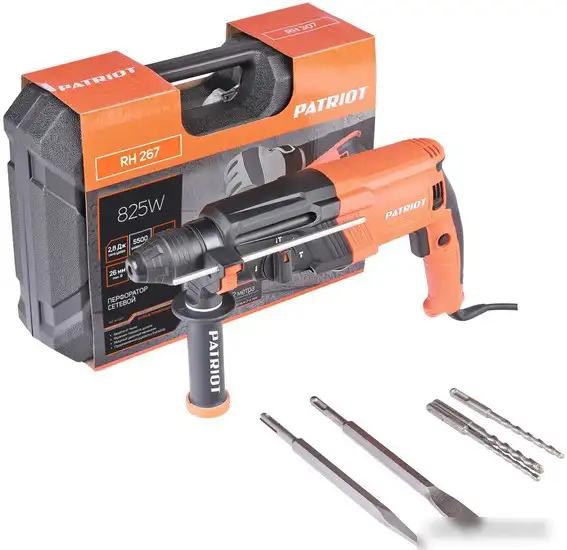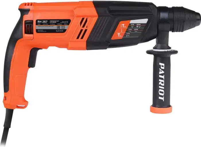 Перфоратор Patriot RH 267 подходит для работы с бетоном, металлом и деревом. Он имеет мощность 825 Вт и возможность выполнять три режима: сверление, сверление с ударом и долбление. Максимальный диаметр сверления в бетоне достигает 26 мм, а в металле — 13 мм, что позволяет легко справляться с разными задачами. Устройство работает с патроном SDS-plus и достигает скорости 1350 об/мин и 5500 ударов в минуту, обеспечивая высокую эффективность. В комплект входит дополнительная рукоятка и ограничитель глубины сверления для точности работы. Также есть предохранительная муфта и фиксатор кнопки включения для безопасности и удобства. В комплекте поставляется набор сверл, двор и кейс для хранения и транспортировки. Питание осуществляется от сети с длинным кабелем 2.1 м, что дает свободу передвижения. Перфоратор прекрасно подойдет для домашних и профессиональных задач, благодаря своей надежности и функциям.