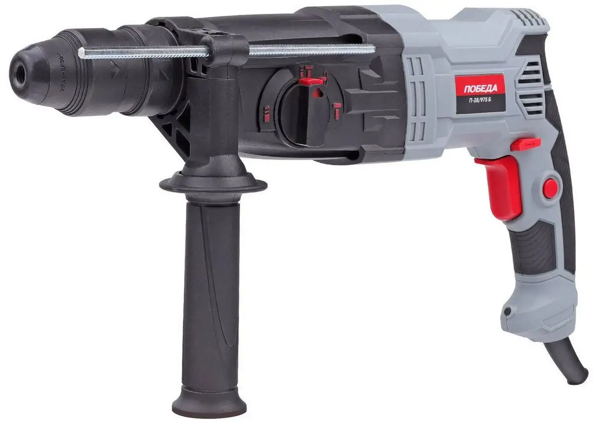 Перфоратор Победа П-28/975 Б подходит для работы с бетоном и кирпичом. Он выполняет три функции: сверление, сверление с ударом и долбление, что облегчает разные виды строительных работ. Мощность устройства составляет 975 Вт, а максимальный диаметр сверления в бетоне — 28 мм. Перфоратор работает с патроном SDS-plus и имеет максимальную скорость вращения 1200 об/мин. Частота ударов достигает 5300 в минуту, а энергия удара — 3 Дж. В комплекте идёт кейс, три сверла по бетону, а также долото и пика для долбления. Дополнительная рукоятка и фиксатор включения делают работу более удобной. Устройство обладает ограничителем глубины сверления и реверсом для удобства эксплуатации. Обратите внимание, что перфоратор не оснащён противовибрационной защитой и пылесборником. Масса прибора составляет 2,5 кг, что делает его относительно лёгким для ручной работы.