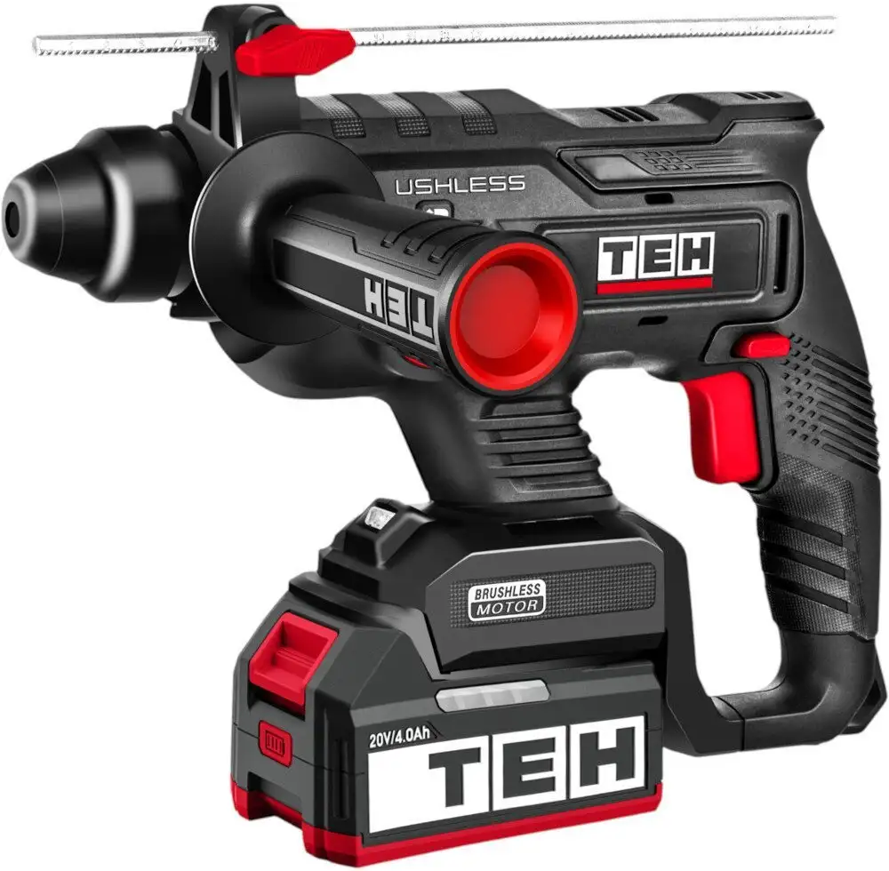 Перфоратор TEH LH220-1B работает в режимах сверления, сверления с ударом и долбления, что делает его универсальным инструментом для разных задач. Он питается от аккумулятора на 20 В, который легко меняется благодаря быстрому креплению, и обеспечивает долгую работу благодаря емкости 4 Ач. Перфоратор оснащён патроном SDS-plus, что упрощает замену сверл и долот. Максимальный диаметр сверления в бетоне составляет 22 мм, в металле — 13 мм, а в дереве — 28 мм. Он работает с высокой скоростью — 1300 об/мин, и совершает до 4600 ударов в минуту с энергией удара 2 Дж. Бесщеточный двигатель помогает повысить эффективность и продлить срок службы оборудования. Дополнительная рукоятка и предохранительная муфта обеспечивают удобство и безопасность при работе. Индикация заряда аккумулятора и подсветка делают использование удобным даже в условиях плохой освещенности.