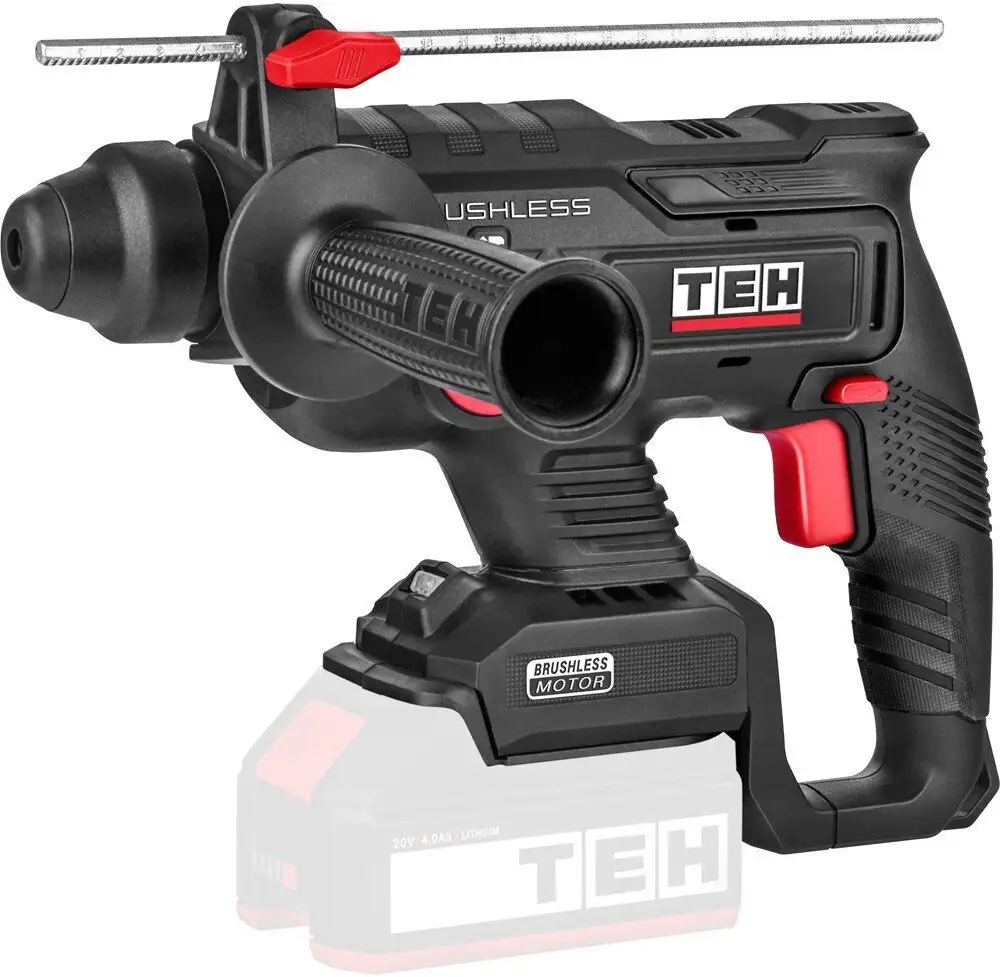 Перфоратор TEH LH220 подходит для различных задач: сверления в бетоне до 22 мм, металле — до 13 мм и дерева — до 28 мм. Он работает в трех режимах: сверление, сверление с ударом и долбление. Устройство оснащено безщеточным двигателем, который обеспечивает долгий срок службы и повышенную эффективность. Максимальная скорость вращения составляет 1300 об/мин, а частота ударов — 4600 ударов в минуту, что позволяет быстро выполнять работу. Патрон типа SDS-plus обеспечивает надежную фиксацию сверл и легкую смену инструмента. В комплект входит дополнительная рукоятка, ограничитель глубины сверления и инструкция, что делает работу удобнее и безопаснее. Перфоратор работает от аккумулятора напряжением 20 В, совместимого с единой платформой аккумуляторов. Класс защиты позволяет использовать его на строительных площадках, а реверс помогает управлять движением сверла. Вес устройства составляет 2380 г, что делает его удобным для работы, хотя и требует некоторой силы при длительном использовании.
