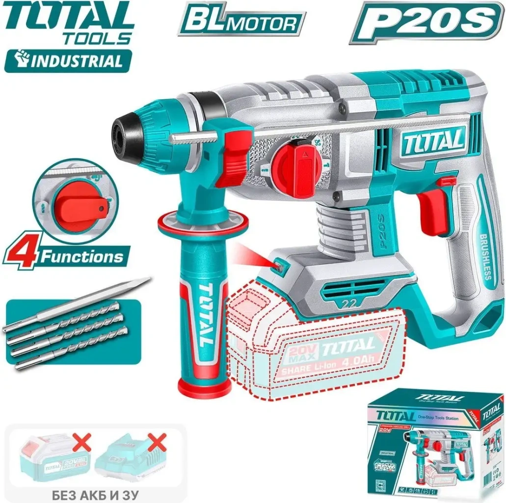 Перфоратор Total TRHLI21228 отлично подходит для сверления и долбления в бетоне, металле и дереве. Он работает в трех режимах: сверление, сверление с ударом и долбление, что делает его универсальным инструментом для ремонта и строительства. Устройство оснащено патроном SDS-plus, который легко меняет сверла и насадки. Максимальный диаметр сверления в бетоне составляет 22 мм, а в металле — 13 мм. Перфоратор имеет бесщеточный двигатель, что обеспечивает долгий срок службы и низкий уровень вибрации. Он снабжен реверсом для удобства работы и ограничителем глубины сверления для точных результатов. В комплект входит дополнительная рукоятка и три сверла по бетону, а также долото, что помогает начать работу сразу. Работа от аккумулятора с напряжением 20 В обеспечивает свободу передвижения, хотя аккумулятор в комплект не входит. Устройство легко управляется благодаря интуитивной конструкции и простым функциям. Это надежный инструмент для профессионалов и домашних мастеров.