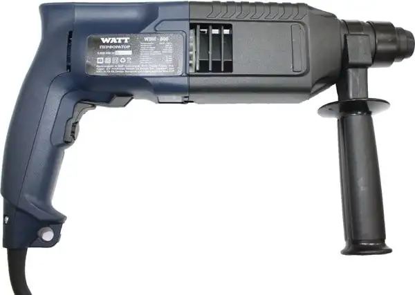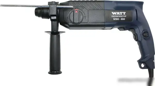 Перфоратор WATT WBH-800 2019 — это мощный инструмент с мощностью 800 Вт, который подходит для разных видов работы. Он умеет сверлить в бетоне до 24 мм, в металле — до 13 мм и в дереве — до 32 мм. Уперитометрическая рукоятка и ограничитель глубины помогают лучше управлять процессом. У него есть три режима работы: сверление, сверление с ударом и долбление, что делает его универсальным. Перфоратор оборудован реверсом и фиксацией кнопки включения для удобства. В комплект входит кейс, сверла и зубило, что удобно для хранения и транспортировки. Вес устройства составляет 2,3 кг, что позволяет работать с ним длительное время без усталости.