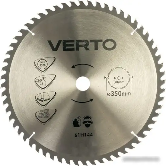Пильный диск Verto 61H144 предназначен для обработки дерева и подходит для использования с различными пилками. Его диаметр составляет 350 мм, а посадочный — 30 мм, что обеспечивает универсальность в работе. У диска 60 зубьев, что позволяет точно и чисто резать материалы. Максимальная скорость работы — 4500 оборотов в минуту, что обеспечивает эффективное выполнение задач. Толщина реза составляет 3.2 мм, а ширина — 2.2 мм, благодаря чему можно делать тонкие и аккуратные пропилы. Его конструкция сегментированная, что улучшает охлаждение и продлевает срок службы.