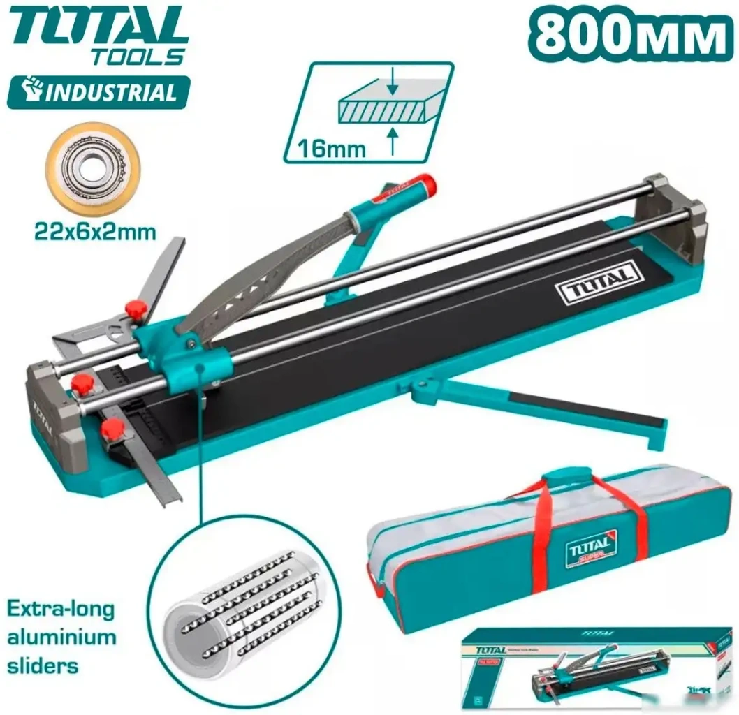 Ручной плиткорез Total THT578002 — это простое в использовании устройство для резки керамической и кафельной плитки. Он работает механически, позволяя выполнять прямой и диагональный рез под углом. Плиткорез оснащён диском диаметром 22 мм и глубиной реза до 16 мм, что подходит для большинства задач по укладке. Длина реза достигает 800 мм, что обеспечивает комфортную работу с крупными плитами. В комплект входит сам плиткорез, удобная сумка и коробка для хранения и переноски. Вес устройства — 12 кг, его легко транспортировать и хранить. Этот инструмент поможет быстро и точно разрезать плитку без необходимости использовать электропривод. Простая конструкция гарантирует надёжность и длительный срок службы. Он идеален для профессионалов и домашнего мастера.