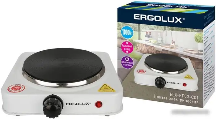 Настольная плита Ergolux ELX-EP03-C01 — это электрическая модель с одной конфоркой, выполненной из эмалированной стали, которая легко моется и долговечна. Она оснащена механическим управлением с плавной регулировкой мощности, что позволяет точно настроить нагрев. Плита имеет общую мощность 1000 Вт, благодаря чему быстро разогревается и хорошо подходит для ежедневного использования. Конфорка диаметром 155 мм подходит для разных размеров посуды. Устройство не имеет таймера, индикатора остаточного тепла и звуковых сигналов, что делает его простым в использовании. Благодаря встроенной блокировке от детей, безопасность при эксплуатации повышается. Эстетичный белый цвет подойдет к любому интерьеру кухни. Плита не оснащена грилем, газовыми или индукционными конфорками, что делает ее максимально простым и удобным прибором для небольших кухонь.