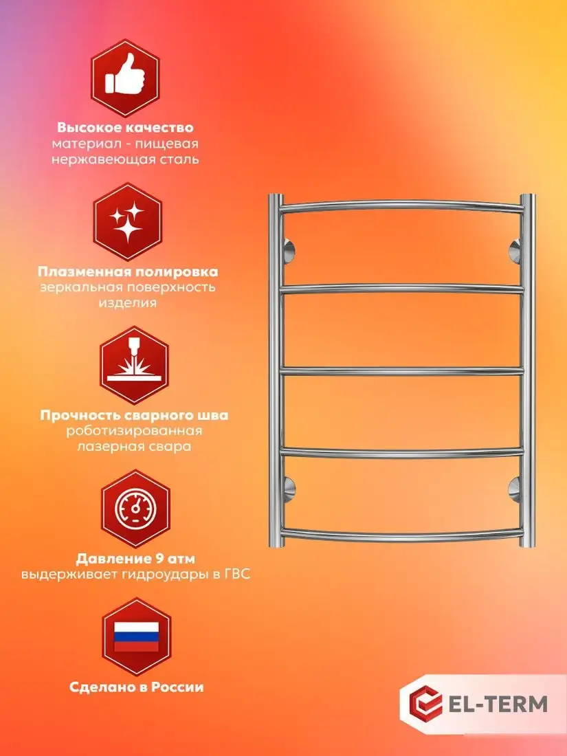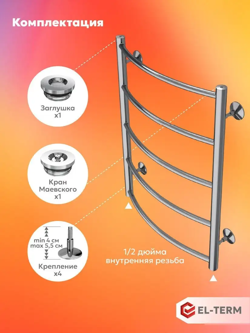 Полотенцесушитель El-term Грас П5 имеет современную форму "лесенка" с пятью ребрами, сделанными из нержавеющей стали, что обеспечивает прочность и долговечность. Он подключается снизу и занимает мало места, его размеры — 70 см в длину, 53,2 см в ширину и 8,4 см в глубину. Устройство рассчитано на подключение к системе с диаметровым коллектором 32 мм и имеет межосевое расстояние 500 мм. Благодаря теплоотдаче в 196 Вт, он быстро нагревается и хорошо сушит полотенца. Устройство комплектуется телескопическим креплением, заглушкой и краном Маевского для воздуха. Конструкция позволяет легко установить и обслуживать полотенцесушитель. Высокое качество материала помогает сохранять внешний вид и сопротивляться ржавчине. Этот полотенцесушитель идеально подходит для современных ванных комнат.