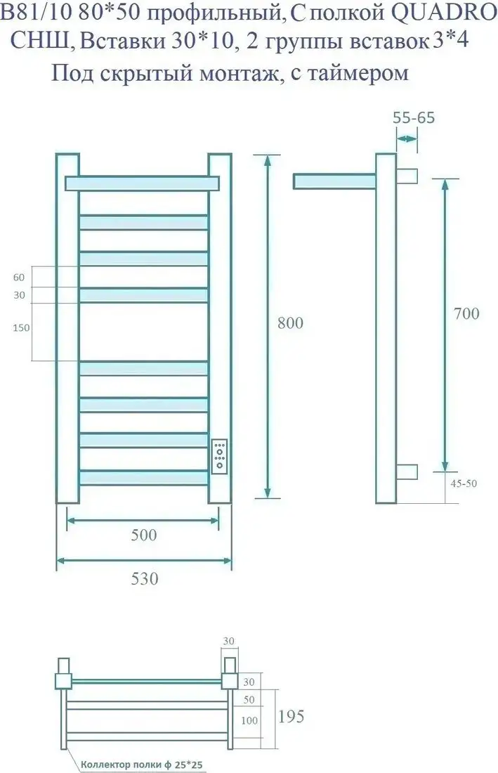 Полотенцесушитель Маргроид Ferrum Вид 81/10 СНШ 80x50 с полкой (графит, таймер справа)