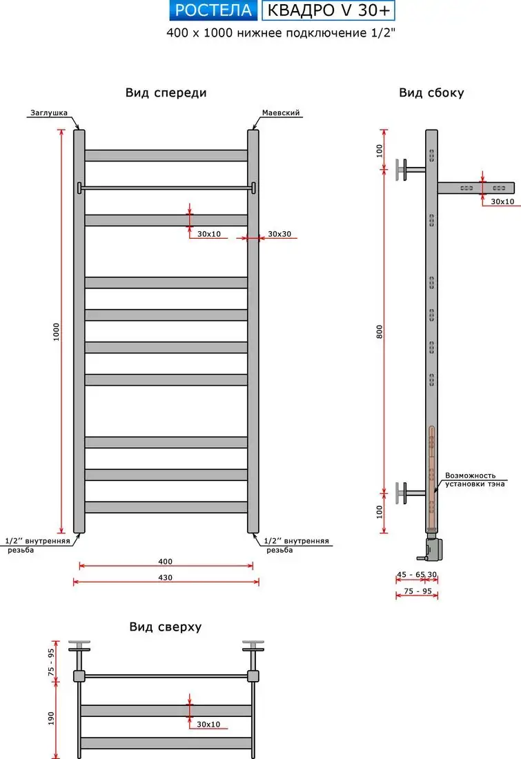 Полотенцесушитель Ростела Квадро V 30 40x100/11 (1/2")
