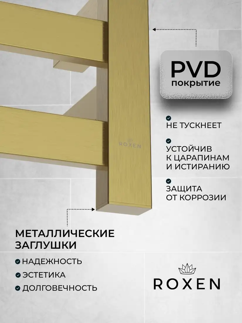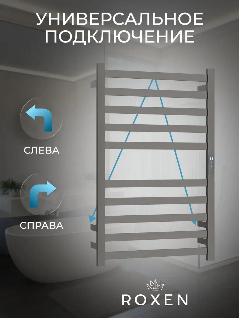 Полотенцесушитель Roxen Plaza 11040-5079BG — это электрическое устройство в форме "лесенки" из нержавеющей стали с 10 ребрами, которое быстро нагревается и эффективно высушивает полотенца. Он подключается боковым способом, что упрощает монтаж в ванной комнате. Благодаря светодиодной индикации и терморегулятору вы можете легко контролировать температуру и работу прибора. Таймер позволяет установить время работы, чтобы сохранить энергию и повысить комфорт. Размеры 79x50х11 см делают его компактным и удобным в использовании. Он потребляет 108 Вт и оснащен скрытым подключением к электросети, что делает его безопасным и эстетичным. В комплект входит съемный электросушитель, крепеж и отражатели для установки. Этот полотенцесушитель подходит для любой ванной, где важна быстрый нагрев и удобство использования.
