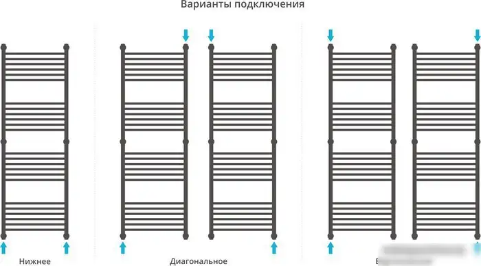 - Диагональное подключение — способствует равномерному нагреву и удобству монтажа.