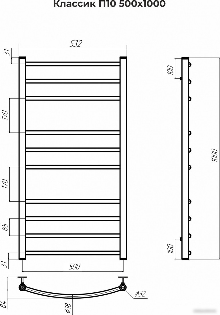 Полотенцесушитель TERMINUS Классик П10 изготовлен из нержавеющей стали и имеет классическую форму "лесенка" с десятью ребрами. Он подключается снизу и отлично подходит для ванной комнаты. Размеры устройства - 100 см в длину и 53,2 см в ширину, его глубина составляет 8,4 см. Теплоотдача этого полотенцесушителя достигает 330 Вт, что обеспечивает быстрое согревание полотенец и комнаты. Благодаря материалу из нержавеющей стали он прослужит примерно 10 лет и устойчив к коррозии. В комплект входят телескопические держатели, кран Маевского, заглушка и паспорт изделия.