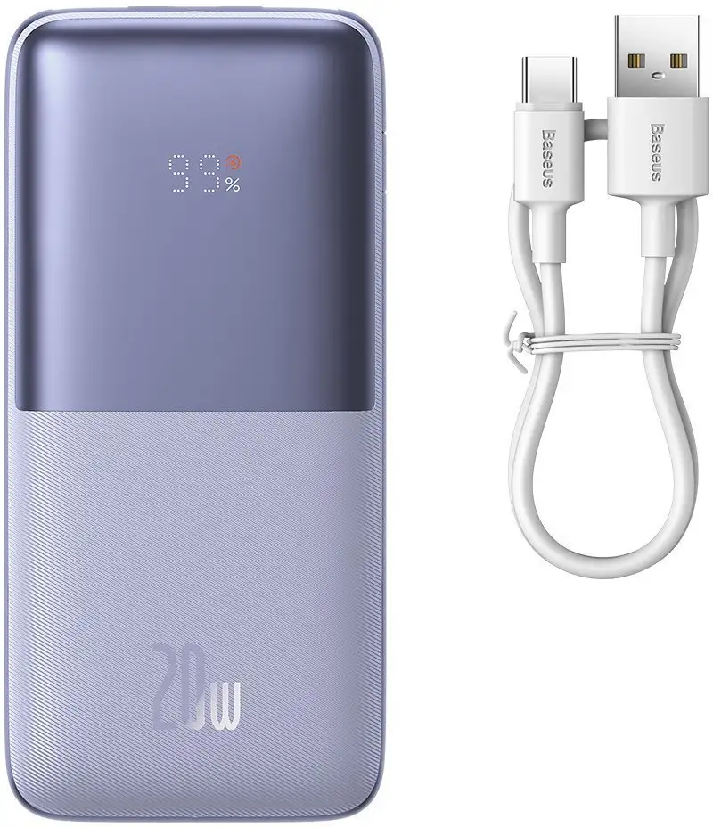 Внешний аккумулятор Baseus Bipow Pro Digital Display обладает ёмкостью 10 000 мА·ч, позволяя быстро заряжать смартфоны, планшеты, умные часы, наушники и портативные колонки. Он оснащён тремя выходами: USB Type-A и USB Type-C, что обеспечивает одновременную зарядку нескольких устройств. Устройство поддерживает быструю зарядку с мощностью до 20 Вт и работает с технологиями Power Delivery и Samsung Adaptive Fast Charging для ускорения процесса. Портативный корпус из пластика в фиолетовом цвете удобно ложится в руку и легко помещается в сумку. Встроенный дисплей показывает уровень заряда и текущую нагрузку, что помогает контролировать состояние аккумулятора. Вход USB Type-C позволяет быстро пополнять запас энергии аккумулятора, а сквозная зарядка даёт возможность одновременно заряжать аккумулятор и подключенное устройство. В комплект входит кабель USB Type-C длиной 0.3 м для зарядки устройства. Его маленький вес и компактные размеры делают его удобным для использования в путешествиях и повседневной жизни.