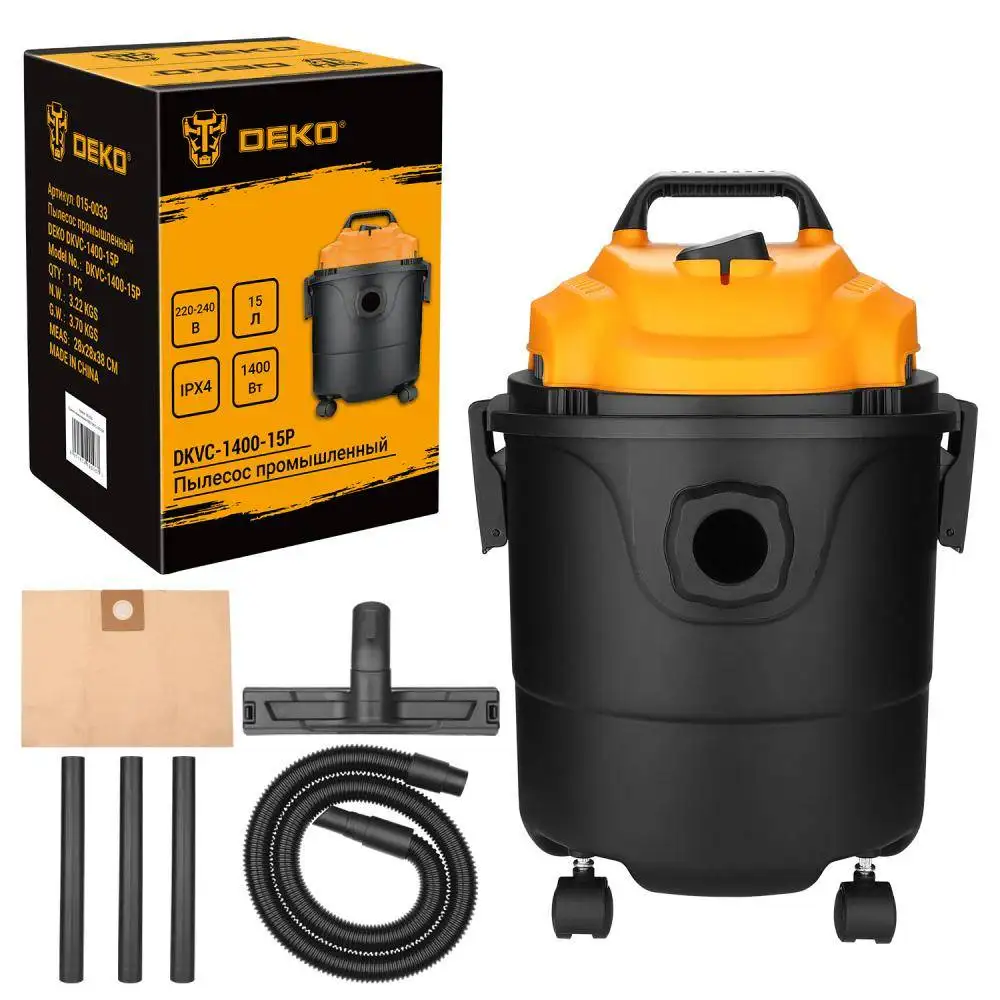 Пылесос Deko DKVC-1400-15P - это удобный и мощный хозяйственный пылесос, который работает при напряжении 220 В. Он имеет мощность 1400 Вт и большой пылесборник на 15 литров, что позволяет убирать большие помещения без частой очистки. Корпус выполнен в ярких цветах - красном и черном, а конструкции содержится три гибких трубы для удобства работы. В пылесосе есть фильтр тонкой очистки, который помогает лучше убирать пыль и грязь. Он не оснащен автоматической регулировкой мощности или сматыванием шнура, что делает его простым и надежным в использовании. В комплекте идут насадки для пола, мебели и щелевая насадка для труднодоступных мест. Благодаря легкому весу в 3.2 кг, им легко управлять и переносить по дому.