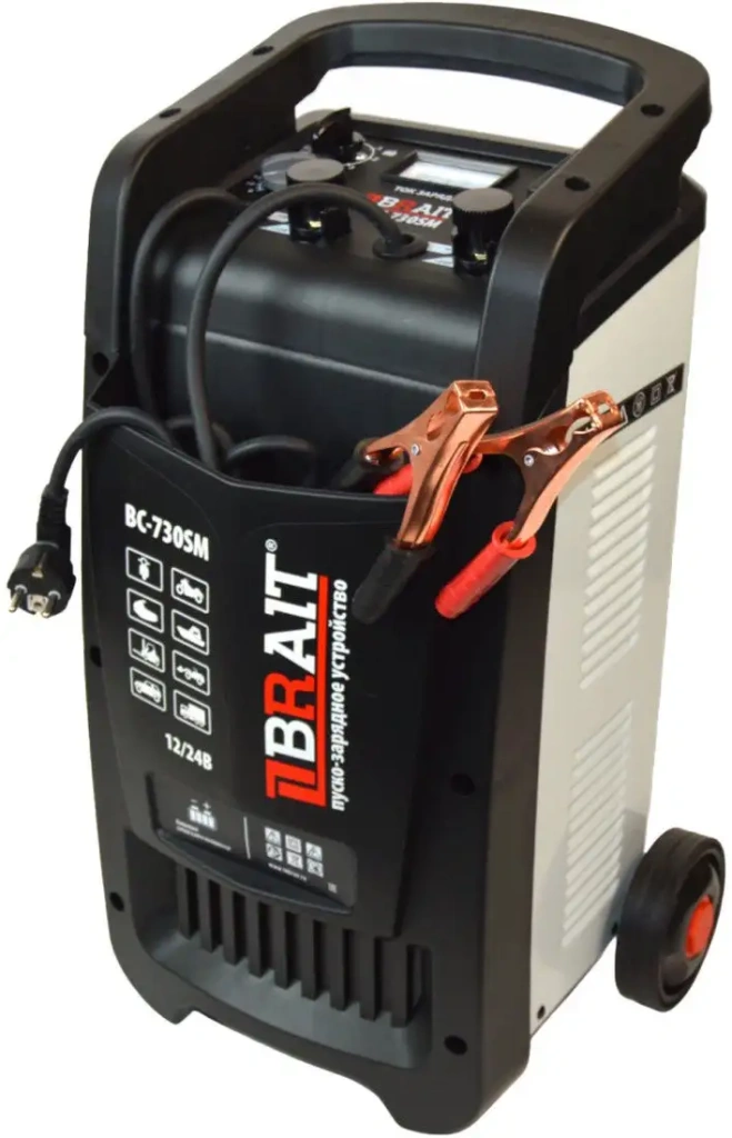 Зарядное устройство Brait BC-730SM подходит для зарядки аккумуляторов емкостью от 40 до 1500 Ач и предназначено для работы с батареями напряжением 12 В и 24 В. Оно обеспечивает ток зарядки в диапазоне 82–90 А, что позволяет быстро и эффективно заряжать аккумуляторы. Устройство подключается к сетю 220 В и имеет мощность до 1920 Вт при 12 В или 3710 Вт при 24 В. Максимальный пусковой ток составляет 700 А, что помогает запускать моторы в сложных условиях. Его компактный дизайн в сером и черном цветах удобно разместить в гараже или мастерской. Зарядное устройство не оснащено USB-разъемами, компрессором или фонариком, что делает его простым в использовании. Этот прибор подходит для автолюбителей и профессионалов, которым нужно надежное устройство для обслуживания аккумуляторов.