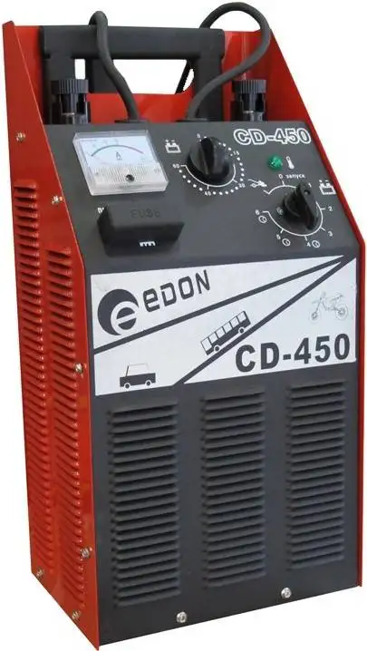 Пуско-зарядное устройство Edon CD-450 предназначено для зарядки батарей емкостью от 40 до 400 Ah, что подходит для различных типов автомобилей. Оно работает при напряжении 220 V и может заряжать батареи напряжением 12 V и 24 V. Мощность зарядки составляет 950 Вт, а пусковой ток достигает 300 А, что позволяет быстро завести автомобиль даже при сильном разряде. Устройство обладает рядом важных характеристик, обеспечивающих безопасную и эффективную работу. Его габариты — 36 × 31 × 63 см, вес — около 15,4 кг, что делает его удобным для переноски и хранения. Благодаря высокой мощности и надежности, оно подойдет для использования в автосервисах и на станциях технического обслуживания. Ниже приведены дополнительные функции, которые повышают удобство использования: