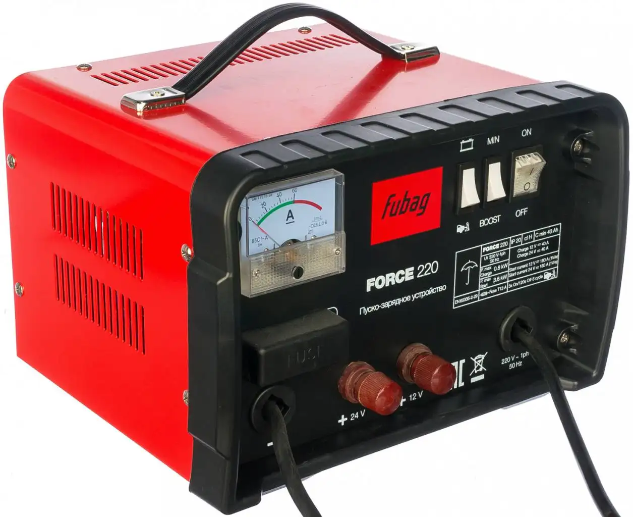 Пуско-зарядное устройство Fubag FORCE 220 — это надежный помощник для запуска и зарядки аккумуляторов в различных условиях. Оно подходит для батарей емкостью от 40 до 700 Ач и работает с напряжением 12 и 24 V. Устройство обеспечивает ток зарядки от 25 до 40 А и обладает пусковым током до 180 А, что помогает быстро запустить двигатель. Работает устройство от сети с напряжением 220 V и имеет компактные размеры — около 30 см в длину и 8,7 кг веса. Оно легко использовать и переносить благодаря удобной конструкции.