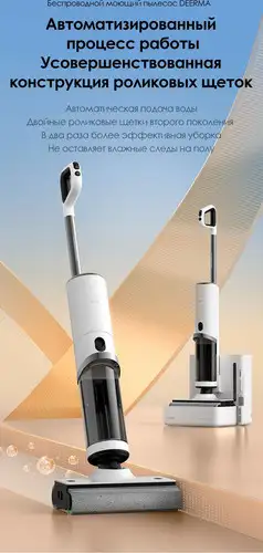 Вертикальный пылесос Deerma DEM-VX910W предназначен для влажной уборки пола и ковров. Модель работает от аккумулятора, его хватает на 45 минут без подзарядки. Мощность устройства составляет 230 Вт, а сила всасывания — 16 кПа, что помогает эффективно собирать пыль и грязь. В комплект входит объемный резервуар для воды на 5 литров и специальная насадка для влажной уборки. Устройство имеет автоматическую регулировку мощности для удобства использования. В корпусе есть станция для хранения с функцией самоочистки и зарядки, что делает его более комфортным в эксплуатации. Такой пылесос легко маневрирует благодаря мягким колесам и весу 6 кг.