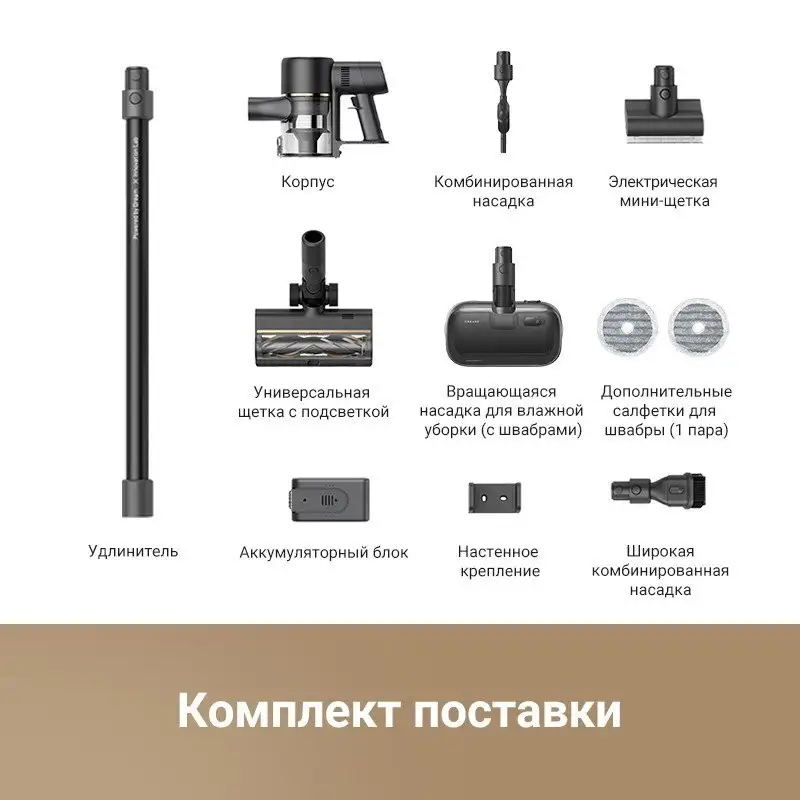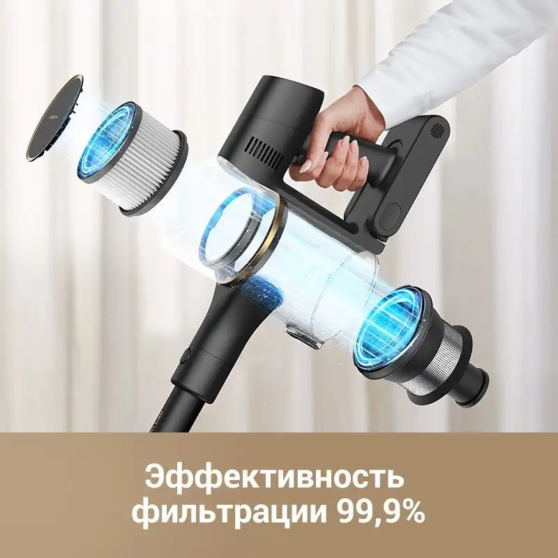 Пылесос Dreame Cordless Vacuum Cleaner R10 Pro Aqua — это вертикальное устройство с функцией влажной уборки, которое легко использовать дома. Он работает от съемного аккумулятора Li-ion с ёмкостью 2500 мА·ч и обеспечивает до 90 минут работы без подзарядки. Мощность всасывания 150 аВт помогает эффективно собирать пыль и грязь с разных поверхностей. В пылесосе есть дисплей и подсветка рабочей зоны, что делает уборку удобнее, особенно в темных местах. Он оборудован фильтром тонкой очистки и контейнером на 0.6 л для сбора мусора. В комплект входят насадки — щелевая, для мебели, с ворсом и щетка-швабра с вращающимися тряпками, что расширяет возможности уборки. Устройство регулирует мощность автоматически, а также имеет ручную настройку на корпусе. Благодаря компактной станции для хранения его легко держать в порядке, а небольшой вес облегчает его перемещение.