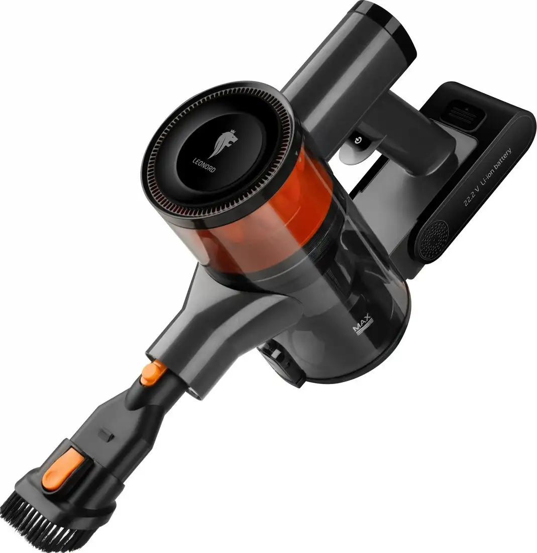 Пылесос Leonord LE-1415 DC — это вертикальное устройство с аккумулятором, которое помогает быстро и удобно убирать дом. Он оснащён мощностью 120 Вт и создан для эффективного всасывания пыли и шерсти животных. Устройство работает тихо, уровень шума составляет 69 дБ, что позволяет не мешать окружающим. Контейнер для пыли объемом 0,5 л легко очищается и не требует замены мешков. Регулировка мощности осуществляется прямо на ручке, а дисплей показывает важную информацию. В пылесосе есть подсветка рабочей зоны и разнообразные насадки — щелевая, для мебели и турбощётка для твердых покрытий. Обратной автоматической регулировки мощности нет, но есть возможность отключения режима и работы в течение до 45 минут. Встроенная станция для хранения облегчает организацию хранения и продвижения. Благодаря современному аккумулятору на 22,2 В и 2200 мА·ч, устройство заряжается за 5 часов и работает от 20 до 45 минут.