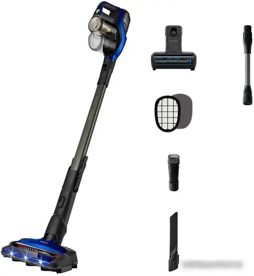 Пылесос Philips XC8049/01 — лёгкое и удобное устройство для чистки дома. Он работает на аккумуляторе Li-ion с напряжением 25.2 В и обеспечивает до 1 часа работы при полном заряде. В устройстве есть встроенные насадки: щелевая, для мебели и турбощётка с подсветкой, что помогает легко очищать разные поверхности. Регулировка мощности на корпусе позволяет выбрать оптимальный режим для каждого типа покрытия. Пылесборник объёмом 0,6 литра легко опорожнять после уборки. Фильтр тонкой очистки помогает задерживать мелкий пыль и аллергенные частицы. Уровень шума составляет 84 дБ, что удобно для использования дома. Встроенные насадки позволяют быстро перейти с пола на мебель и труднодоступные места. Пылесос имеет компактные размеры, шириной 26 см и весит всего 2,7 кг, легко управляется одной рукой.