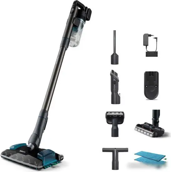 Вертикальный пылесос Philips XC8055/01 подходит для влажной уборки пола и ковров благодаря использованию контейнера объемом 0,6 л. Он легко управляется благодаря регулировке мощности на ручке, что помогает адаптировать работу под разные поверхности. В устройстве есть подсветка рабочей зоны, которая облегчает уборку в темных участках. В комплект входит щетка для ковров и пола, а также насадки для мебели, шерсти домашних животных и щелевая насадка, чтобы убирать в труднодоступных местах. Беспроводной дизайн обеспечивает свободу движения, а аккумулятор Li-ion дает до 1 часа работы на полной зарядке. Время зарядки составляет около 6,5 часов, а вес — всего 1,72 кг, что делает его удобным в использовании и хранении. Устройство работает тихо — уровень шума составляет 80 дБ. Оно не имеет дополнительных фильтров, но хорошо справляется с различными видами уборки. Этот пылесос идеально подходит для людей, ценящих мобильность и эффективность.