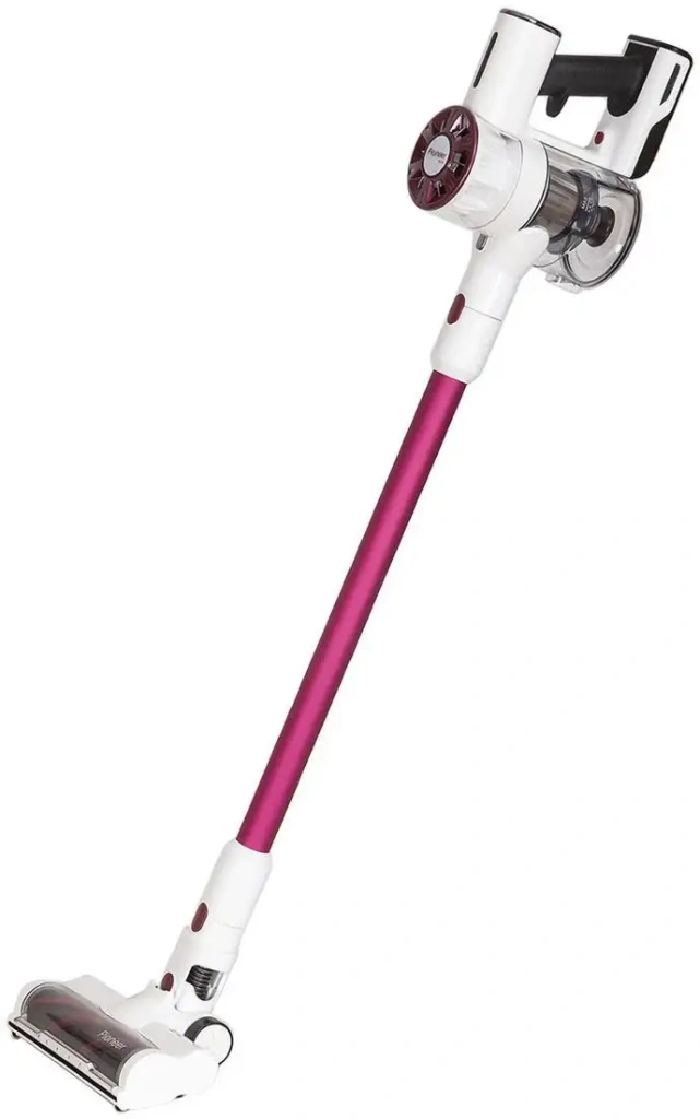 Пылесос Pioneer VC455S — это вертикальный аккумуляторный пылесос, который отлично подходит для уборки шерсти животных и домашних загрязнений. Он работает от съемного Li-ion аккумулятора напряжением 22.2 В, обеспечивая до 35 минут работы без подзарядки. Мощность устройства составляет 200 Вт, а мощность всасывания — 60 Вт, что позволяет эффективно убирать пыль и мусор. Корпус выполнен в розово-белых тонах, он легкий и удобный в использовании. В комплект входит щетка для ковра и пола, щелевая насадка и щетка для мебели с ворсом. Для удобства есть подсветка рабочей зоны, которая помогает убирать в труднодоступных местах. Объем пылесборника составляет 0.8 литра, и его легко опустошать. Уровень шума не превышает 76 дБ, что делает уборку комфортной. Пылесос также имеет регулировку мощности на ручке для комфортной работы. Он не оснащен дополнительными насадками внутри корпуса и станцией для хранения.