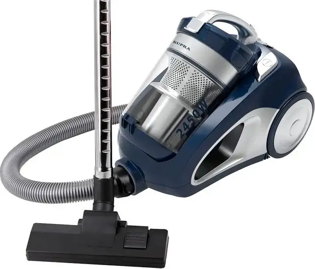 Пылесос Supra VCS-2420 — это классический прибор с контейнером емкостью 3,5 литра, который легко собирает пыль и грязь. Его мощность составляет 2 450 Вт, а всасывание достигает 420 Вт, что обеспечивает хорошую уборку. Трубка у пылесоса телескопическая, а длина сетевого шнура — 5 метров, что позволяет удобно обрабатывать большие комнаты. Шнур автоматически сматывается, а устройство не требует дополнительных насадок внутри корпуса. В комплект входят щетка для ковров и полов, а также щелевая насадка для труднодоступных мест. Фильтр тонкой очистки задерживает пыль и аллергенные частицы, создавая более чистый воздух. Пылесос работает от сети с напряжением 230 В и легко управляется. Его корпус выполнен в синем цвете, что придает ему современный вид. Нет функции автоматической регулировки мощности или станции для хранения, поэтому управление простое и понятное.