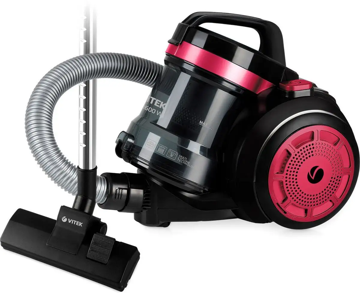 Пылесос Vitek VT-1838 — классическая модель с контейнером и мощностью 1 600 Вт, которая легко справляется с уборкой дома. Он оснащён трубой с телескопической регулировкой длины и длинным сетевым шнуром в 5 метров для удобства использования. В устройстве есть функция автоматического сматывания шнура, что облегчает его хранение. Мощность всасывания составляет 250 Вт, что обеспечивает хорошую очистку разных поверхностей. В пылесосе установлен фильтр тонкой очистки для повышения качества воздуха. Объём пылесборника — 2 литра, его легко опустошать и поддерживать чистоту. В комплект входят щётки для ковра, пола, мебели и щелевая насадка для труднодоступных мест. Он работает без регулировки мощности, что упрощает управление, и не имеет дополнительных насадок внутри корпуса. Этот пылесос окрашен в красный и черный цвета и произведён в Австрии, что говорит о качестве сборки и долговечности.