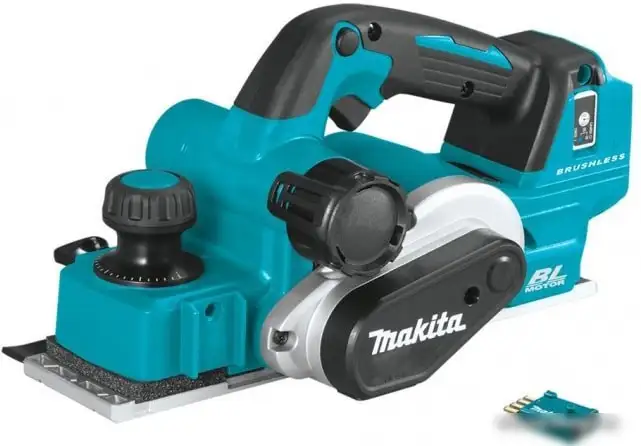 Рубанок Makita DKP181ZU — это мощный инструмент с бесщеточным двигателем, который работает от аккумулятора 18 В, но в комплекте он не идет. Его частота вращения вала достигает 12 000 об/мин, что позволяет быстро и точно обрабатывать древесину. Рабочая ширина составляет 82 мм, а глубина строгания — до 3 мм, благодаря чему можно делать разные виды ошкуривания и рейки. Устройство оснащено V-образным пазом для аккуратных соединений и параллельным упором для точной обработки. Быстрая работа обеспечивается лёгким весом — всего 3,3 кг, и компактными размерами. Ее можно подключить к пылесосу для чистоты на рабочем месте и даже к Bluetooth для управления или обновлений. В комплект входит все необходимое, кроме аккумулятора и зарядки, что дает возможность использовать уже имеющиеся аккумы Makita.