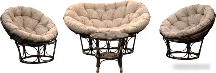 диван + 2 кресла + столик, стол: 590×590×550 мм, основание - искусственный ротанг, столешница - стекло, сиденье: 1050×1050 мм, материал: ткань