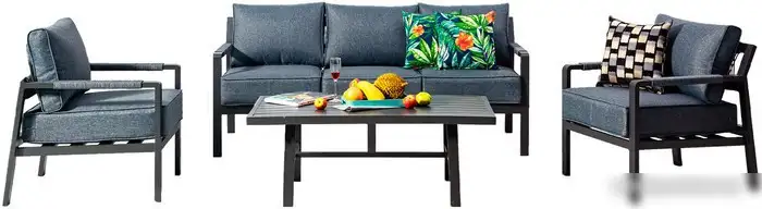 Этот набор садовой мебели Торонто OUT-0027 подходит для отдыха на улице. В комплект входит диван, два кресла и столик с прямоугольной стеклянной столешницей. Каркас мебели сделан из алюминия, что обеспечивает прочность и легкость. В креслах установлены мягкие подушки, повышающие комфорт во время отдыха. Столи и кресла выполнены из ткани, что делает их приятными на ощупь. Мебель не складывается и не раздвигается, она полностью готова к использованию. Размеры стола позволяют разместить много предметов, а габариты кресел создают уютную зону отдыха. Объемный дизайн и универсальный графитовый цвет подходят для любого участка. Мебель весит 55 кг, ее легко установить на открытом воздухе. Она прочная и долговечная благодаря выбранному материалу.