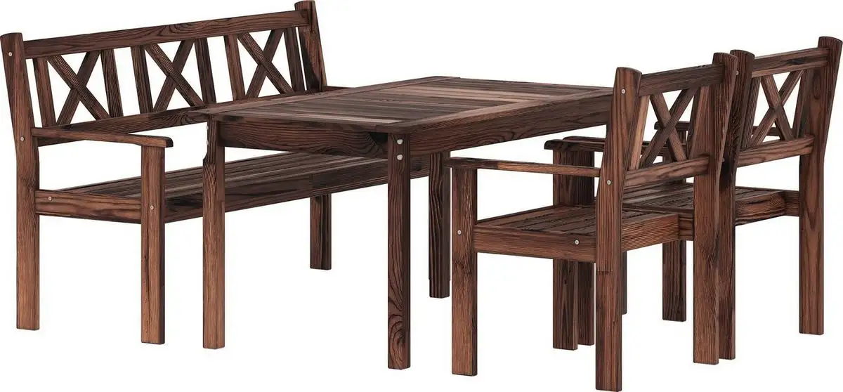 Обеденная группа Sundays Ф-183 1/2/1 включает стол, скамью и два кресла, выполненные из прочного дерева. Стол имеет прямоугольную форму, его длина составляет 1334 мм, ширина — 770 мм, а высота — регулируется от 750 мм. Все элементы — из тёмно-коричневого дерева, что придаёт уют и стиль вашему дому. Кресла оснащены удобными деревянными сиденьями и имеют оптимальные размеры: ширина 640 мм, глубина 590 мм, а высота — 900 мм. Скамья поможет разместить гостей или семью, создавая тепло и комфорт. Благодаря качественному материалу и продуманной конструкции, набор служит долго и легко поддается уходу. В комплекте нет подушек и зонтов, их можно приобрести отдельно. Этот набор отлично вписывается в любой интерьер, делая его более уютным и практичным.