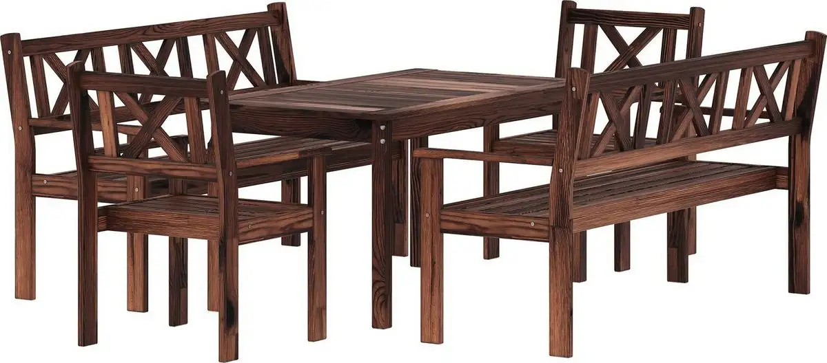 стол + 2 скамьи + 2 кресла, стол: 1334×770×750 мм, основание - дерево, столешница - дерево, сиденье: 640×590 мм, материал: дерево