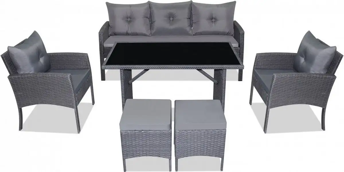 Обеденная группа Sundays LUC-75R включает стол, два кресла, два пуфика и подушки, что делает её удобной для семейных обедов и дружеских встреч. Стол имеет прямоугольную стеклянную столешницу, которая легко очищается и придает элегантность. Каркас выполнен из прочного искусственного ротанга и стали, благодаря чему мебель устойчива и долговечна. Кресла и пуфики имеют удобные сиденья из ротанга и подушки, обеспечивающие комфорт во время отдыха. Стол не складывается и не раздвигается, что способствует стабильности конструкции. Цвет мебели — серый, он легко сочетается с различными интерьерами. В комплект также входят подушки, увеличивающие комфорт при использовании. Высота и размеры мебели позволяют удобно разместиться всей семье или компании друзей. Благодаря прочным материалам и современному дизайну эта обеденная группа прослужит долгие годы. Эта мебель отлично подойдет для организацилого отдыха на улице или в просторной кухне.
