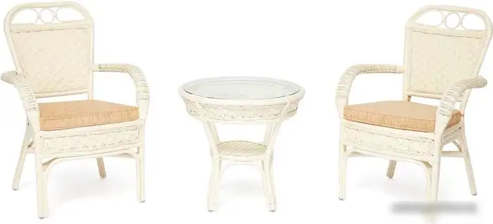 стол + 2 кресла, стол: 600×600×550 мм, основание - ротанг, столешница - стекло, сиденье: 670×640 мм, материал: ткань