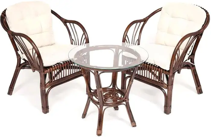 стол + 2 кресла, стол: 500×500×565 мм, основание - ротанг, столешница - стекло, сиденье: 670×615 мм, материал: ткань