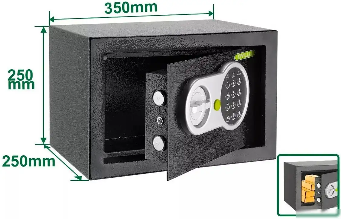 Мебельный сейф Dyllu DTEB1525 предназначен для хранения ценных вещей и документов. Он выполнен в черном цвете и легко устанавливается на стену, занимая мало места. Внутри есть полки для удобного размещения вещей, а толщина двери составляет 3 мм, что обеспечивает надежную защиту. Электронный замок позволяет быстро открыть сейф и очень трудно взломать. Размеры сейфа: ширина 350 мм, высота 250 мм и глубина 250 мм, весит он всего 8 кг, что облегчает его перемещение и монтаж. Этот сейф хорошо подойдет для дома или офиса, чтобы хранить важные предметы в безопасном месте.