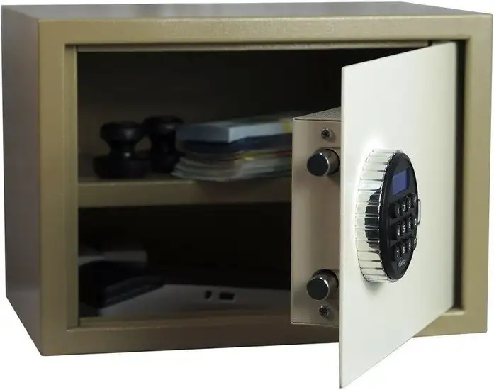 Мебельный сейф Klesto 25E предназначен для хранения ценных вещей и документов. Он выполнен из прочной стали и способен выдержать попытки взлома. Внутри есть одна полка для аккуратного размещения предметов. Сейф закрывается электронным замком, который легко управляется с помощью кода, а также оснащён аварийным ключом на случай отключения электронного устройства. Его размеры позволяют установить сейф в стену или на пол, а вес в 7,5 кг делает его устойчивым и надёжным. Этот сейф отлично впишется в любой интерьер благодаря своим белым и коричневым цветам.