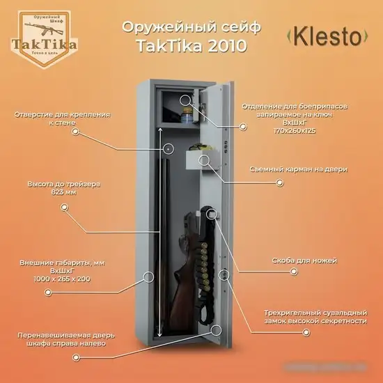 Этот оружейный сейф Klesto TakTika 2010 предназначен для хранения оружия и ценностей. Он выполнен из прочной стали и имеет объем 53 литра, что позволяет удобно разместить оружие и важные вещи. Сейф оснащен взломостойким замком с ключом для надежной защиты. Размеры 265х1000х200 мм позволяют разместить его на стене или полу, а его вес составляет всего 11 кг. Конструкция не включает полки, но внутри есть трейзер для хранения мелких предметов. Толщина двери и стенок всего 1 мм обеспечивает баланс между безопасностью и легкостью. Это надежный и удобный вариант для хранения оружия дома.